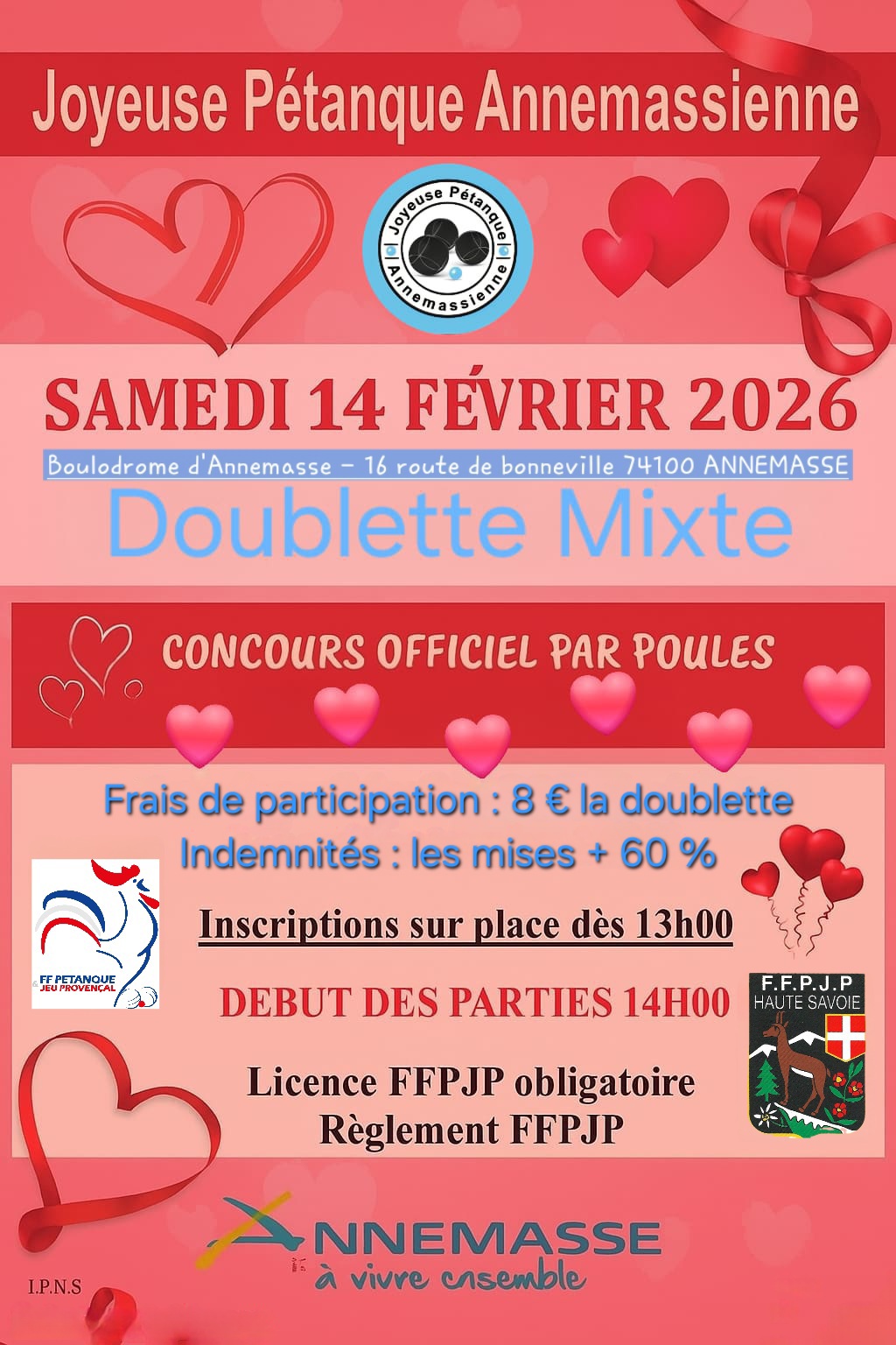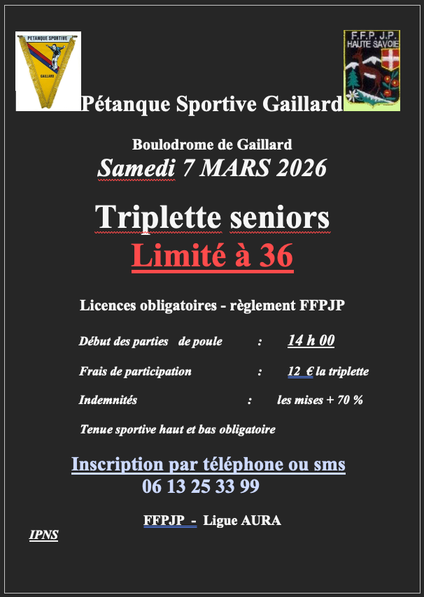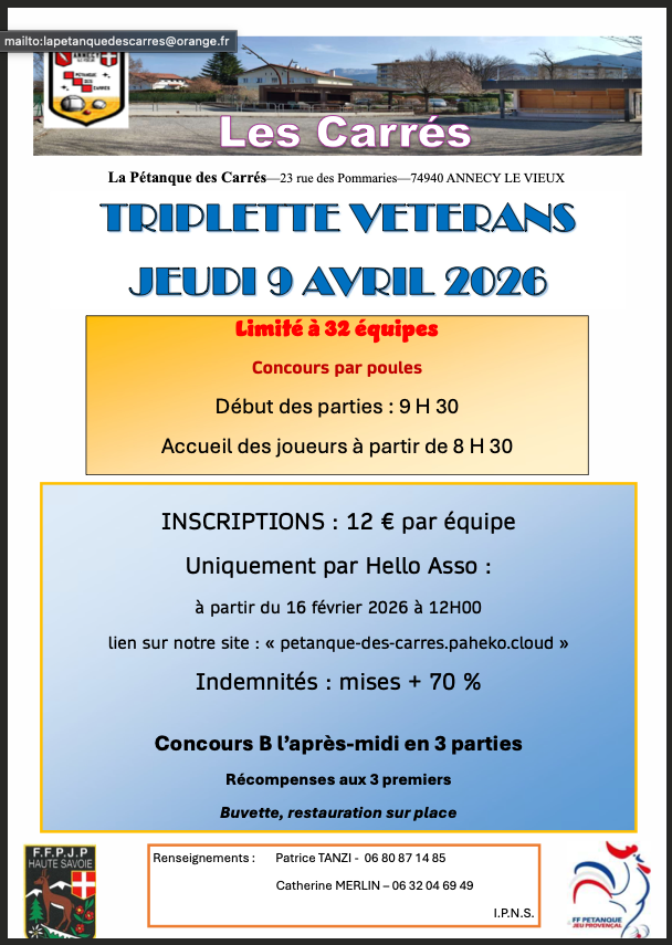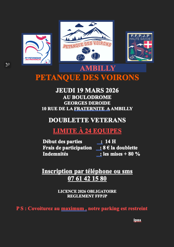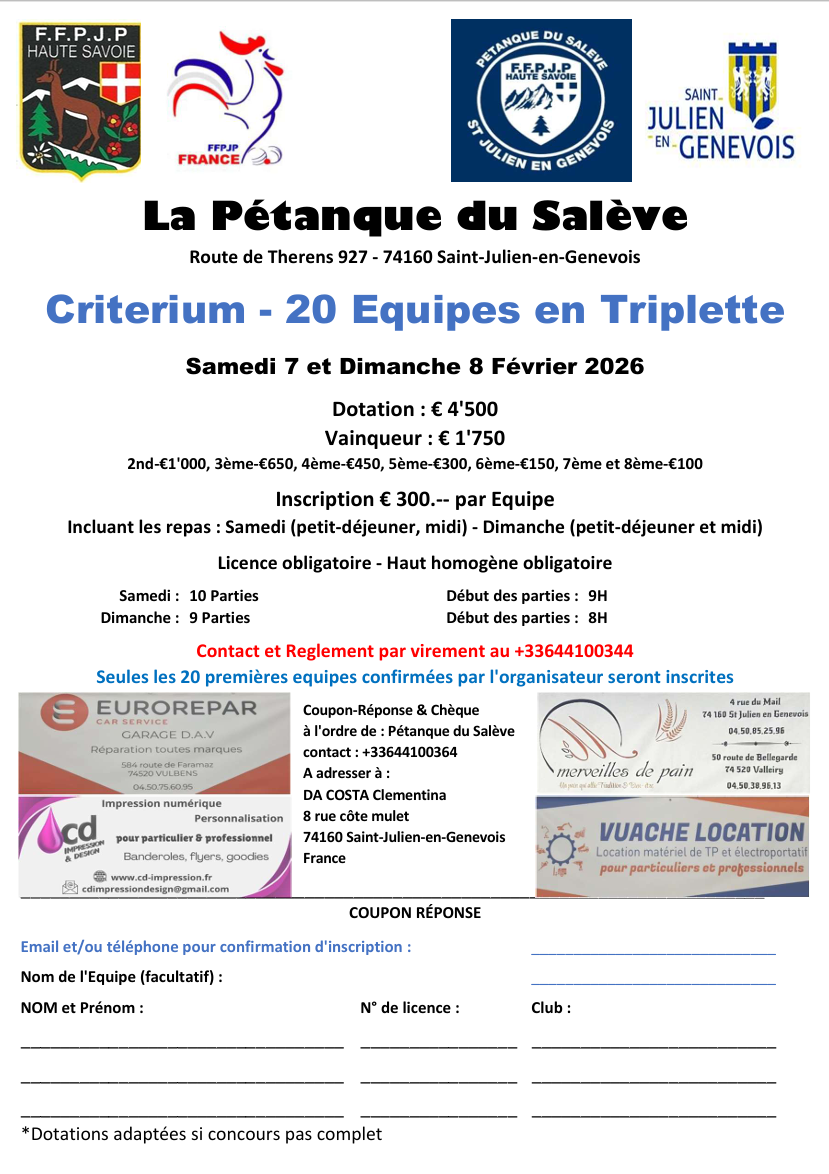 Ce qualificatif MBO se fera au boulodrome de Sallanches le 22 FEVRIER 2026 à partir de 8H00. Ce concours est limité à 32 triplettes « homogène club ». Les 32 premières équipes inscrites seront prises. (inscription : 90€ / équipe, comprenant l’inscription et les repas)