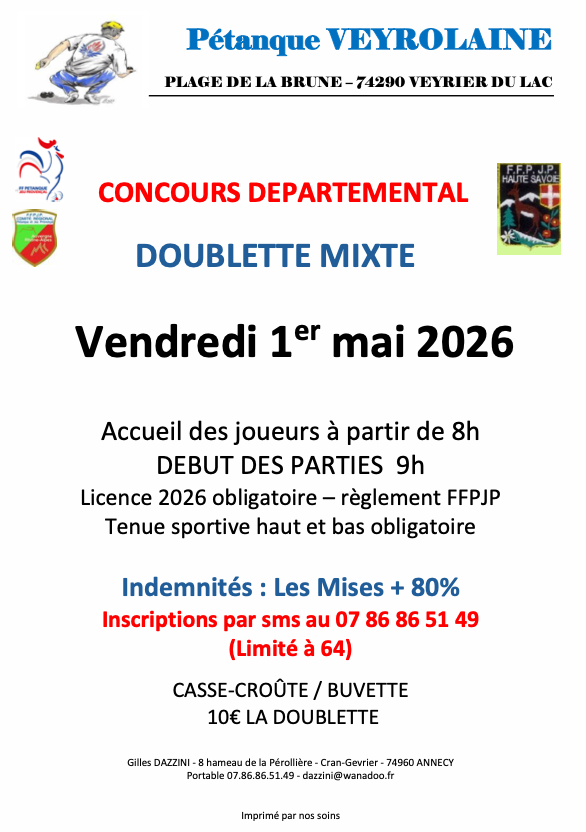 Le règlement administratif et sportif version 2026 de la FFPJP introduit la possibilité de faire évoluer le prix de l’inscription aux concours jusqu’à 7 €. Le Comité Départemental, lors de sa réunion du 23 février 2026, s’est prononcé sur ce point. Dorénavant, pour tous les concours officiels (dont les affiches ne sont pas éditées au 24 février), le montant de l’inscription est fixé à 5 €. De plus, le calcul des dotations est établi dans une fourchette de 50 % à 100 % des mises (en plus des mises).